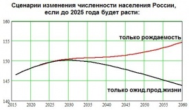 Такое же население может проживать в России к 2025 году, если будет повышаться рождаемость на те же 2,5% в год, так что через 8 лет она достигнет 2,2 детей на женщину – уровня воспроизводства. Подчеркнем, что это может быть достигнуто даже без увеличения ОПЖ.