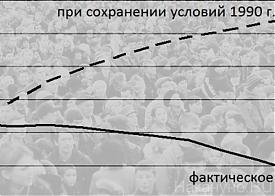 Наконец, для максимального исключения погрешности анализа была проведена коррекция. Был сделан параллельный расчет для тех же стартовых условий, в которых после каждого года вводились рождаемость и смертность, фактически зафиксированные в России. В результате к началу 2002 г. вычисленное население было меньше реального на 0,75 млн. Поэтому величина 75 тыс. в год прибавлялась к потенциальному населению страны, которое было бы при сохранении рождаемости и смертности 1990 г. Таким образом, практически исключив погрешность вычисления, были получены шокирующие результаты.