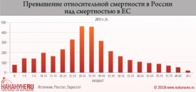 Как уже ранее писало Накануне.RU, в России относительная смертность в трудоспособном возрасте превышает европейскую в разы, причем наиболее сильно как раз в самых трудоспособных возрастах – до 5 раз!
