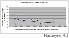 Россия хорошо вписывается в этот график. Расходы у нас составляют порядка 400 евро на душу населения в год, а смертность более чем на 20% превышает смертность в доковидную эпоху. Так что точка, относящаяся к России, будет располагаться перед началом кривой, почти в левом верхнем углу графика, хотя и ниже, чем точки, описывающие Болгарию и Румынию.