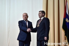 В соответствии с законом региона, Сергей Корепанов надел на Владимира Якушева знак губернатора – символичную цепь. После чего спикер думы поздравил его со вступлением в должность.