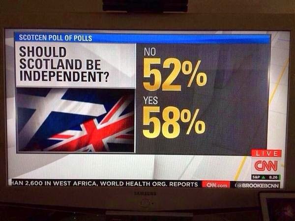 Американский телеканал CNN сообщил, что на референдуме о независимости Шотландии от Великобритании приняли участие 110% избирателей. Инфографическое сообщение о 58% проголосовавших за независимость и 52%, отдавших голос против проиллюстрировало новость о предварительных результатах референдума.