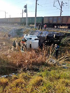 В Кузбассе товарняк перевернул КамАЗ и сошел с рельсов
