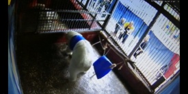 В вольер медведей положили две половинки пластмассовой бочки. Один из мишек взял с собой в бассейн одну из них и во время игры надел её на себя, а снять не смог. Вскоре рабочие по уходу заметили новый "наряд" белого медведя.