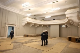 На объекте сейчас задействовано 60 человек, скоро численность увеличат до 150. Масштабная реконструкция – труд не только строителей, но и реставраторов, которые восстанавливают старинную лепнину по сохранившимся чертежам.