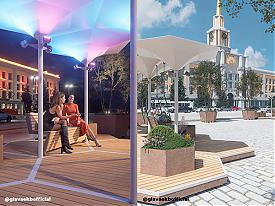 Для отдыха на площади расстелют настил и установят скамейки, зонтики и клумбы. Все конструкции мобильные, а потому их легко можно будет перенести для проведения праздников, фестивалей, спортивных соревнований или ярмарок. Подробнее о том, что будет на площади, мы писали ранее.