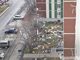 По данным Накануне.RU, подобное происходит не впервые, однако раньше под окнами дома или на ветках деревьев можно было заметить лишь несколько вещей: брюки, шапку, носки, обувь и так далее. Бардак такого масштаба соседи наблюдают впервые.