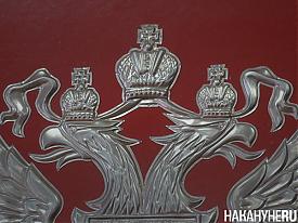 "Государственный герб Российской Федерации представляет собой четырехугольный, с закругленными нижними углами, заостренный в оконечности красный геральдический щит с золотым двуглавым орлом, поднявшим вверх распущенные крылья. Орел увенчан двумя малыми коронами и - над ними - одной большой короной, соединенными лентой. В правой лапе орла - скипетр, в левой - держава. На груди орла, в красном щите, - серебряный всадник в синем плаще на серебряном коне, поражающий серебряным копьем черного опрокинутого навзничь и попранного конем дракона", - говорится в законе, подписанном президентом, а до этого одобренном Госдумой и Советом Федерации.