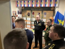 Заместителю начальника Главного организационно-мобилизационного управления Генштаба Вооруженных сил РФ вице-адмиралу Владимиру Цимлянскому показали экспозиции, посвященные истории Великой Отечественной войны, локальных войн, специальной военной операции.